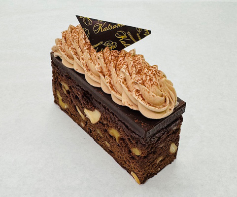 刻んだカシューナッツとくるみ入りのブラウニーにショコラガナッシュをかけてキャラメル風味のクリームで仕上げています。